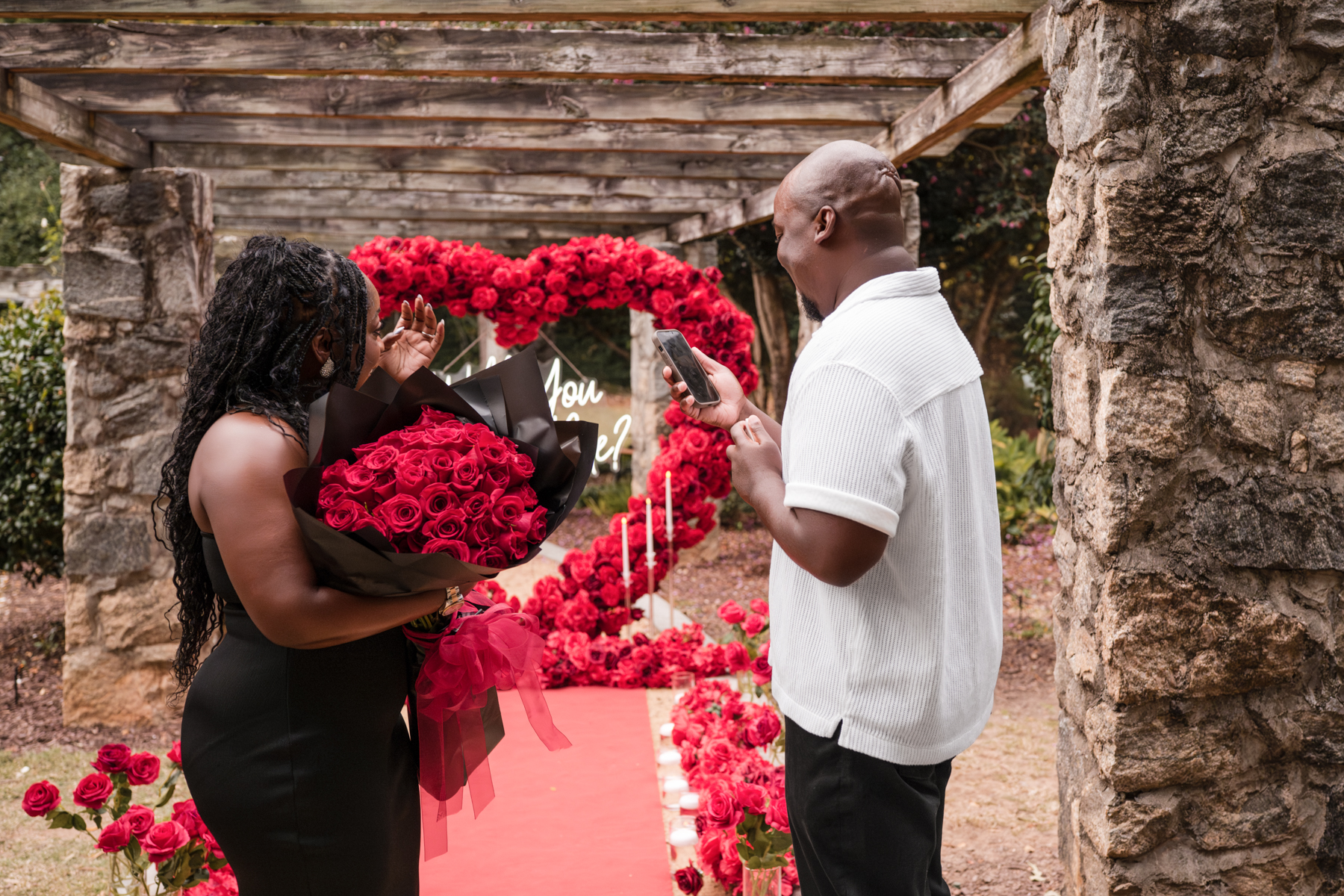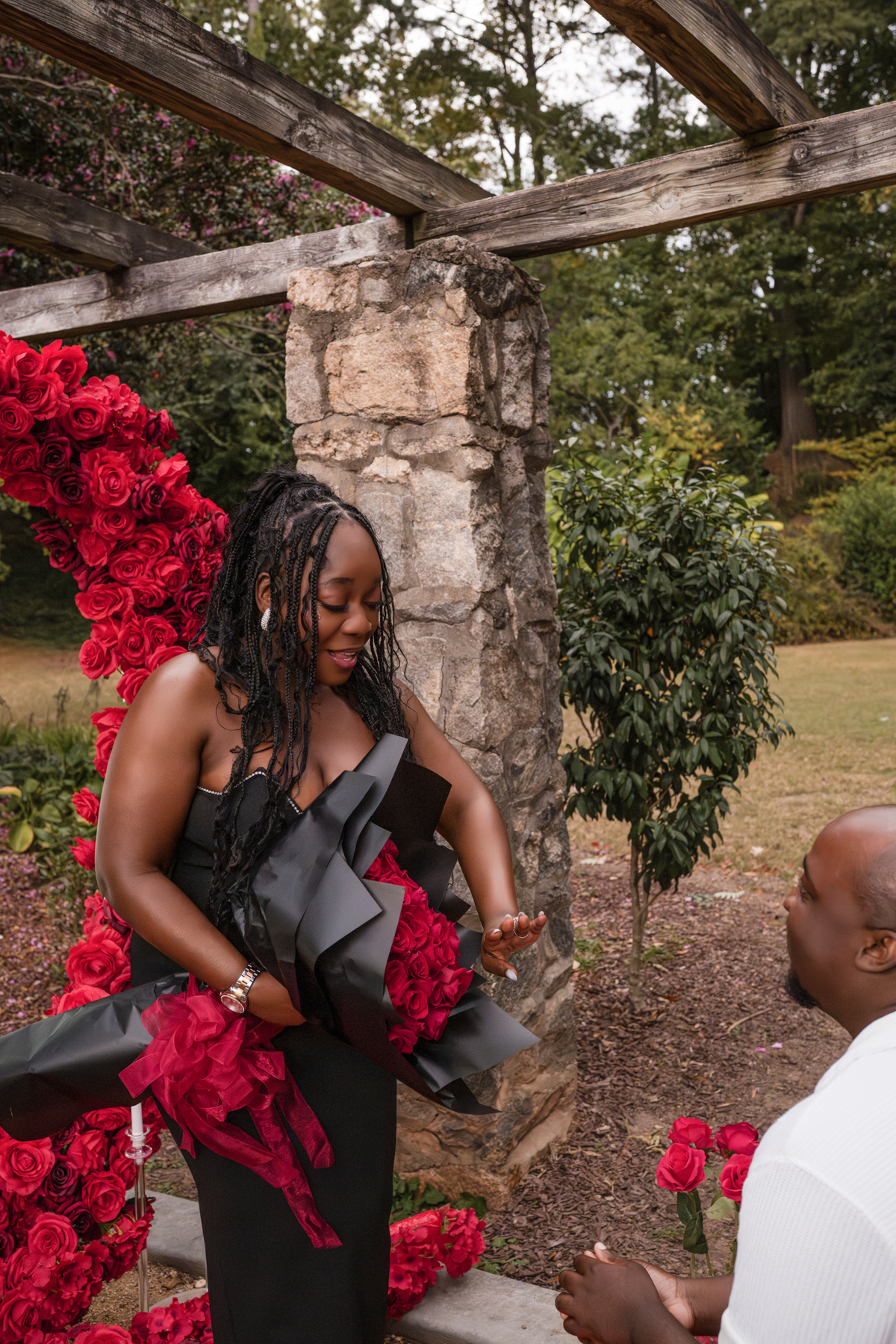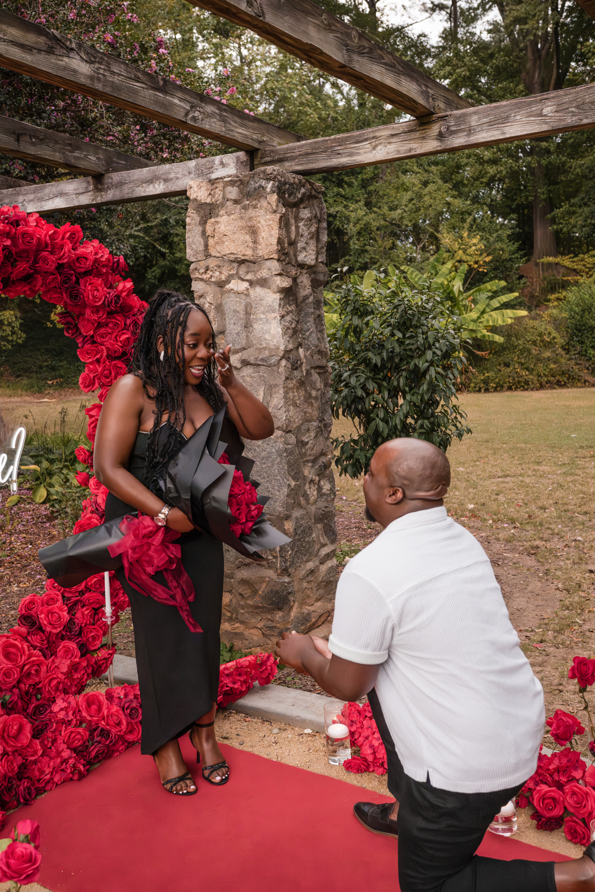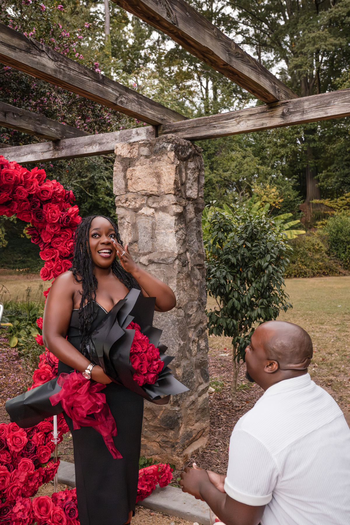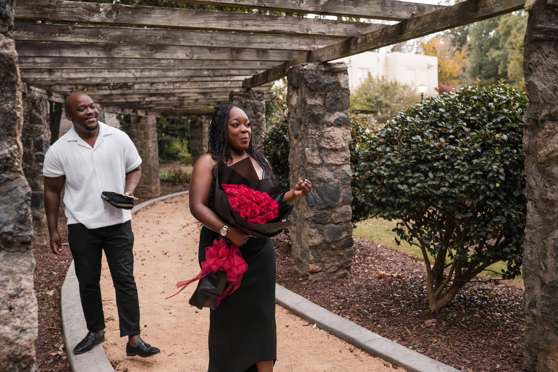 Once I got the text that they had arrived, I was on high alert. They strolled slowly together through the garden toward the red rose display, and the moment she began to realize what was happening, I stepped in and started photographing. The surprise landed fully, and her response was a perfect mix of shock, warmth, and even humor.