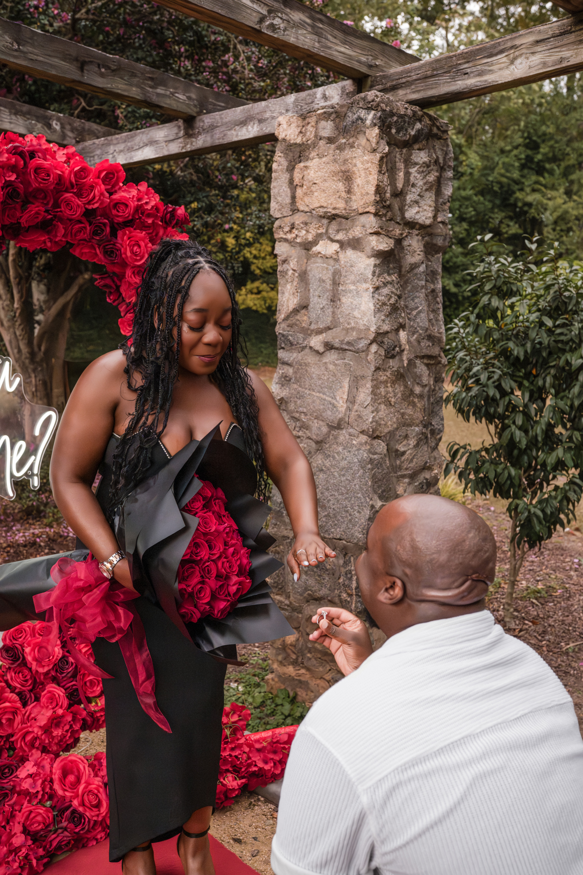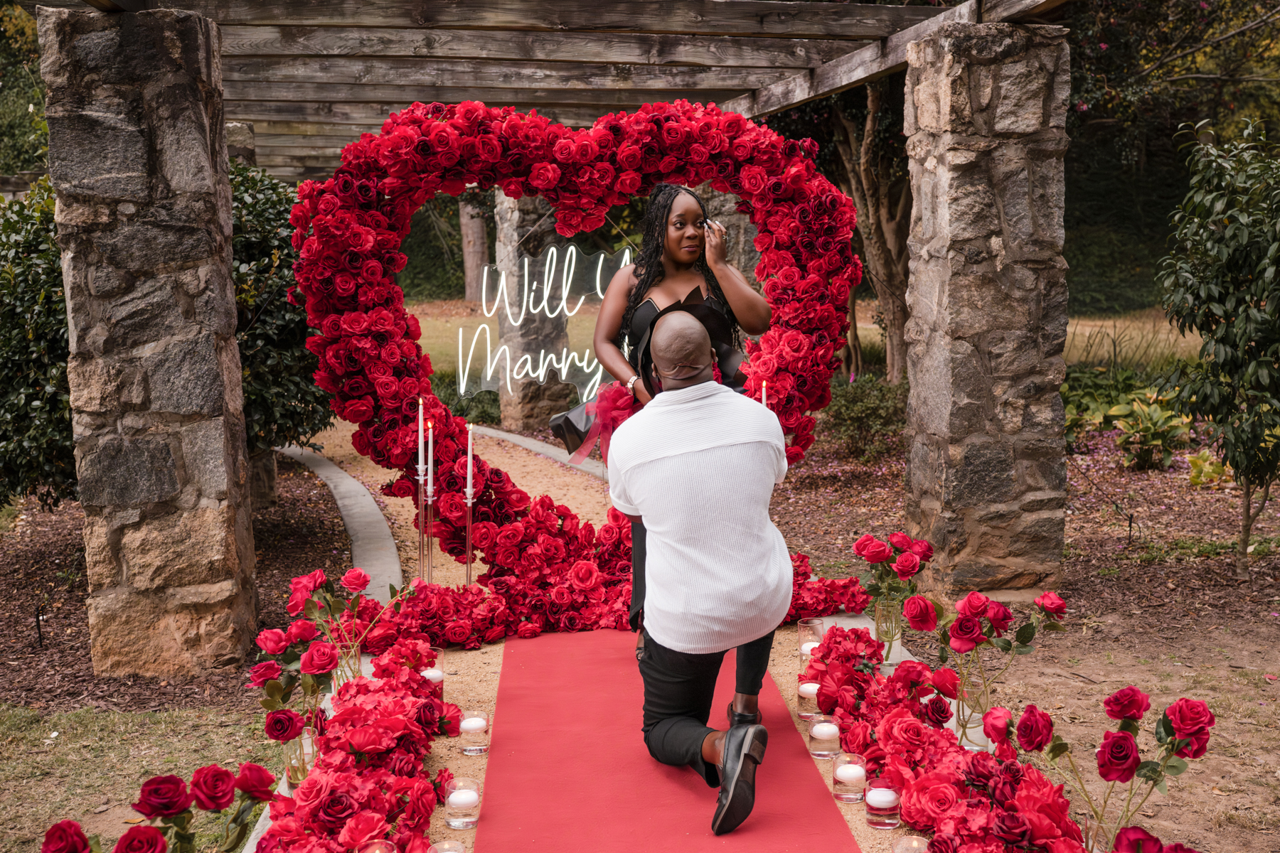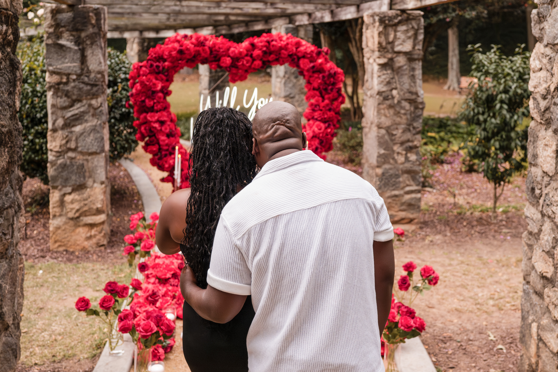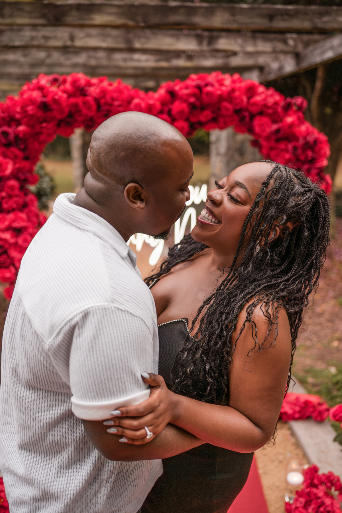 Once I got the text that they had arrived, I was on high alert. They strolled slowly together through the garden toward the red rose display, and the moment she began to realize what was happening, I stepped in and started photographing. The surprise landed fully, and her response was a perfect mix of shock, warmth, and even humor.