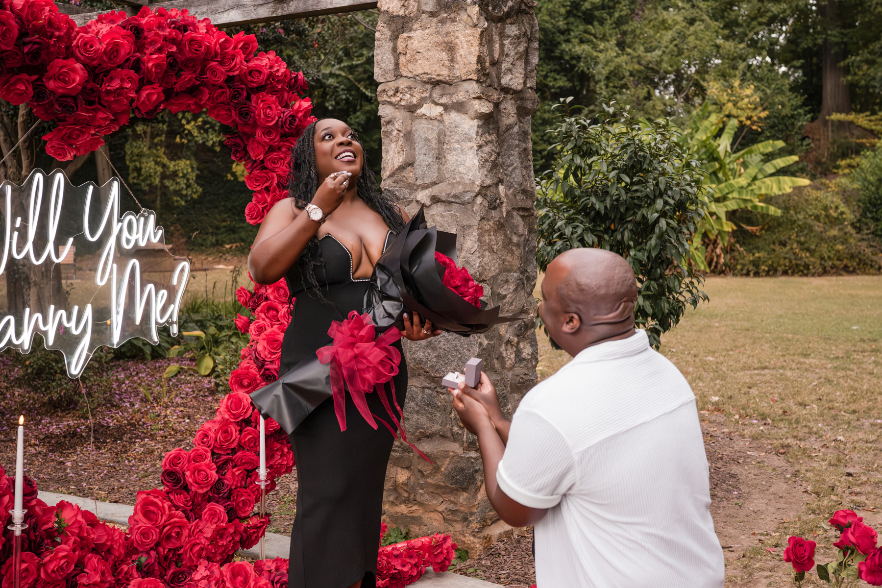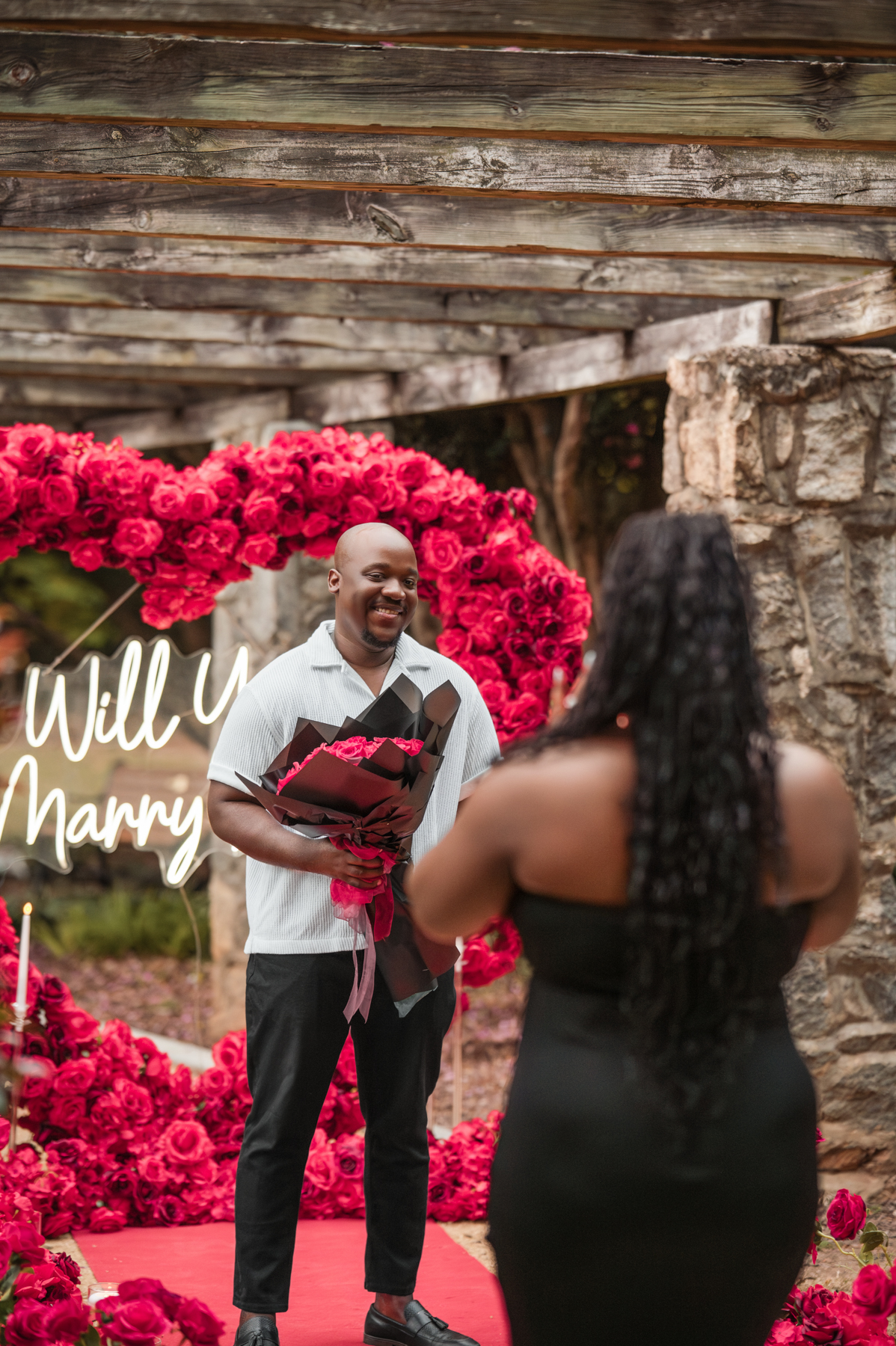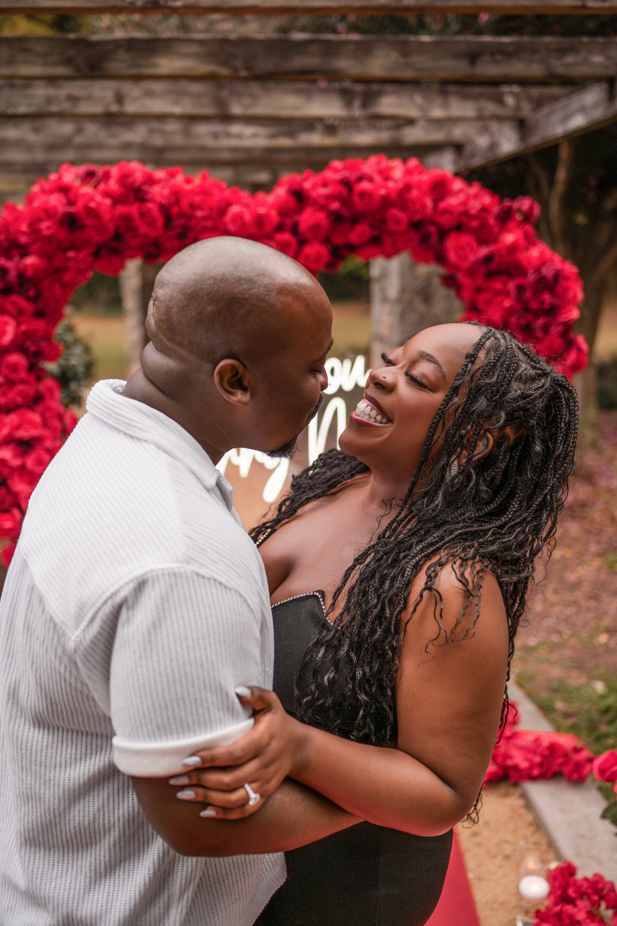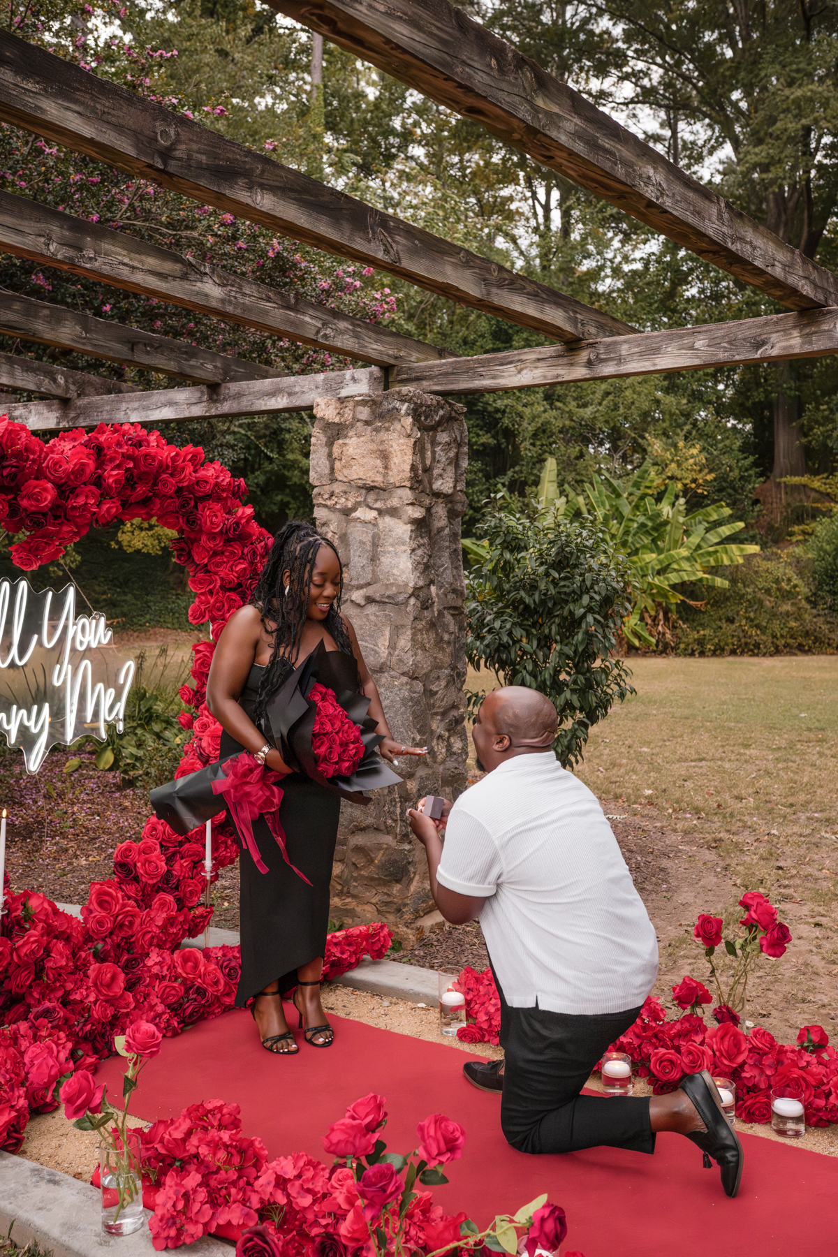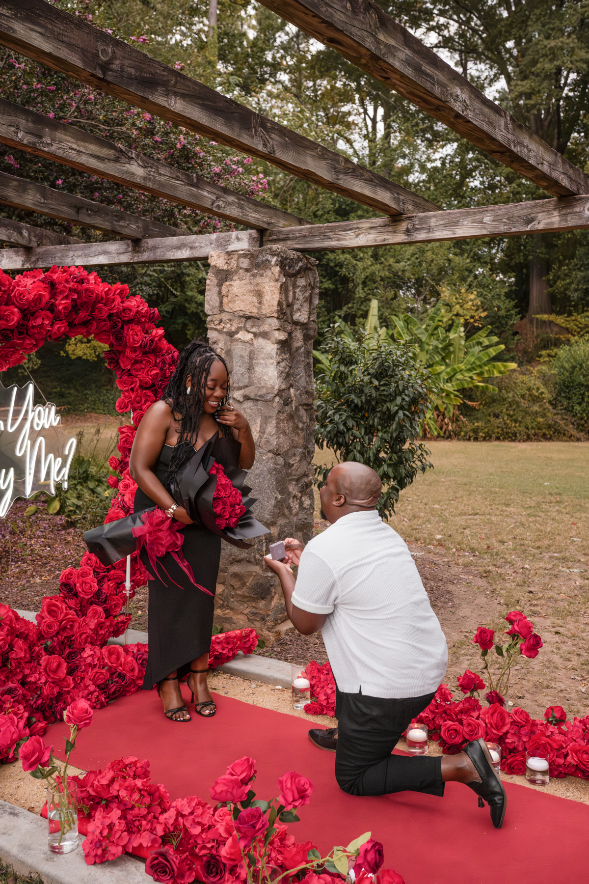 Once I got the text that they had arrived, I was on high alert. They strolled slowly together through the garden toward the red rose display, and the moment she began to realize what was happening, I stepped in and started photographing. The surprise landed fully, and her response was a perfect mix of shock, warmth, and even humor.