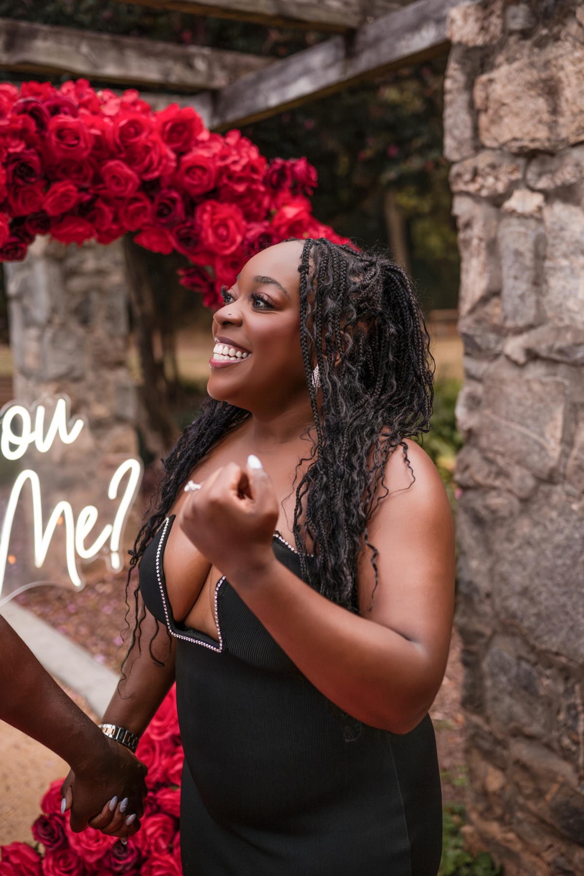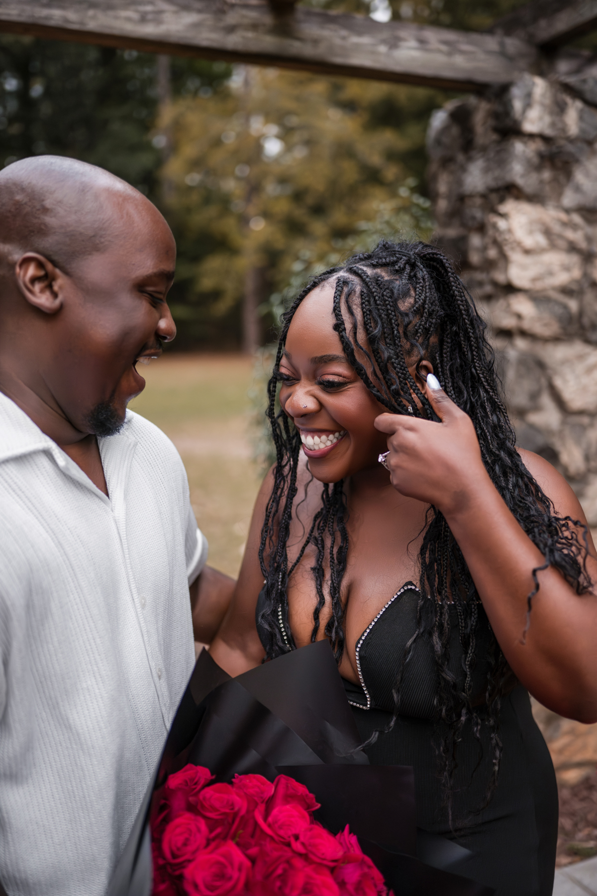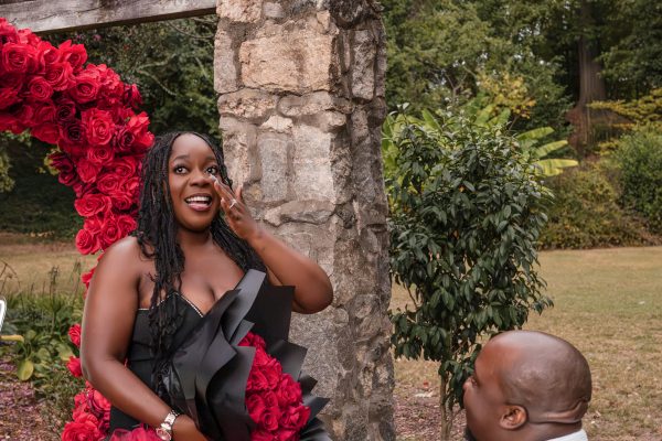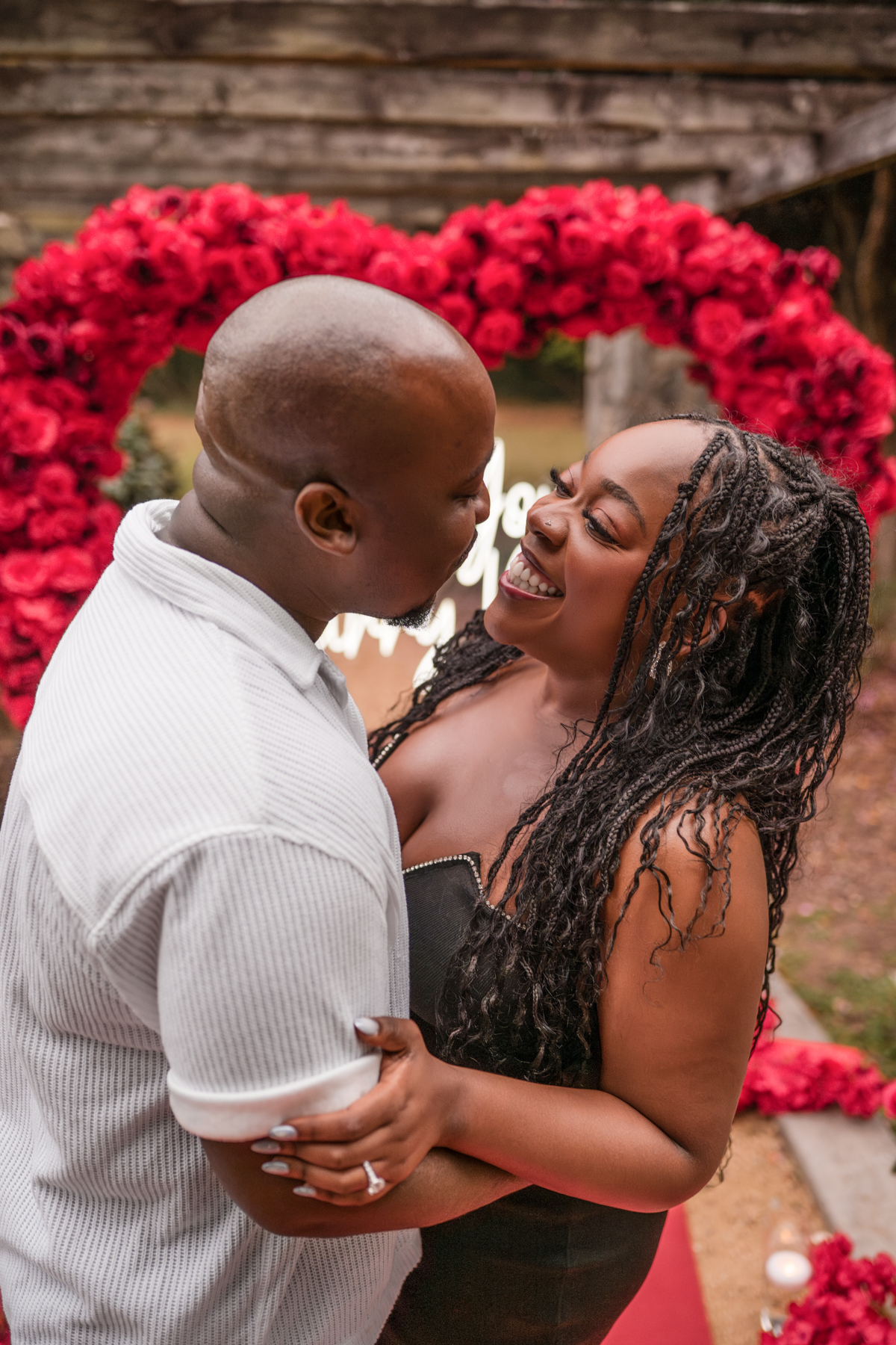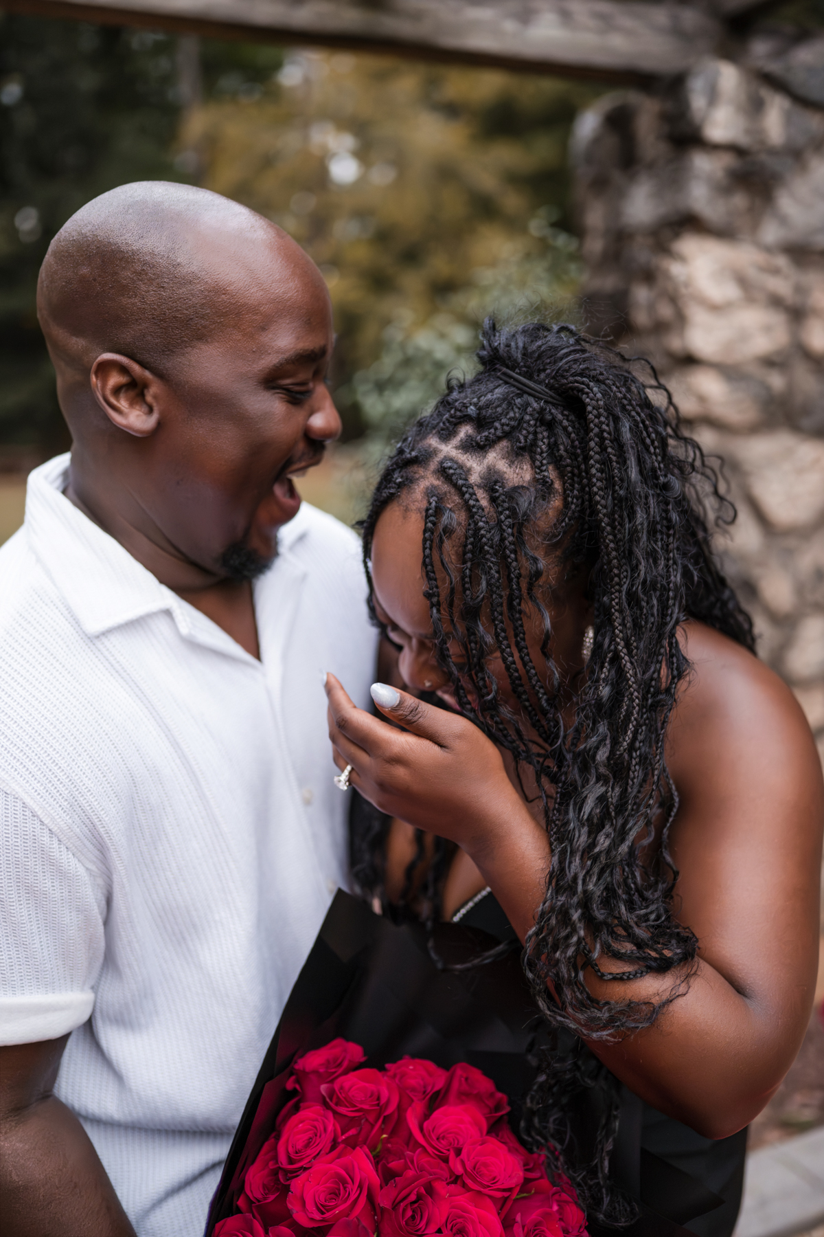 Once I got the text that they had arrived, I was on high alert. They strolled slowly together through the garden toward the red rose display, and the moment she began to realize what was happening, I stepped in and started photographing. The surprise landed fully, and her response was a perfect mix of shock, warmth, and even humor.