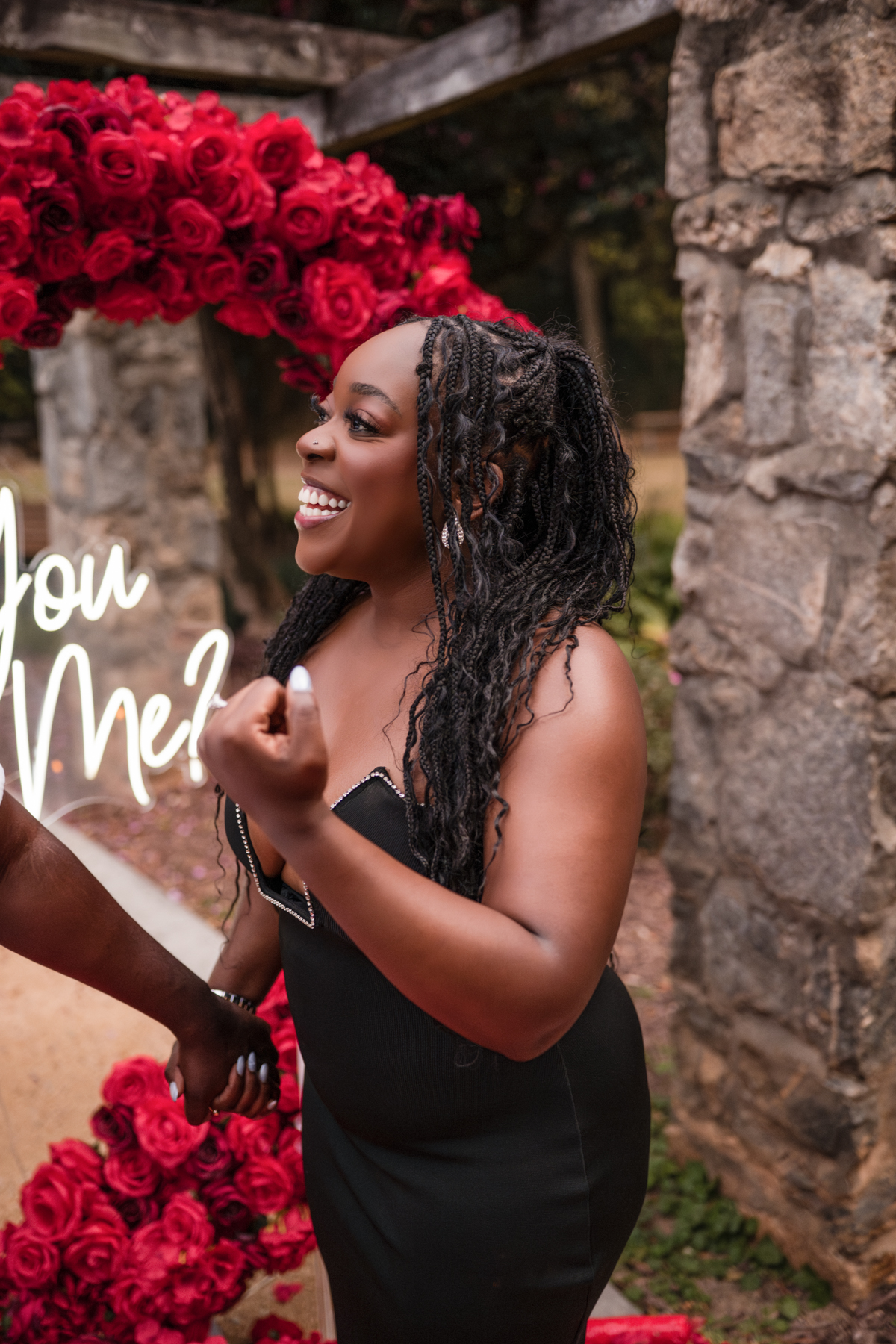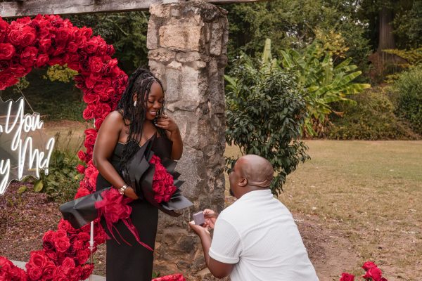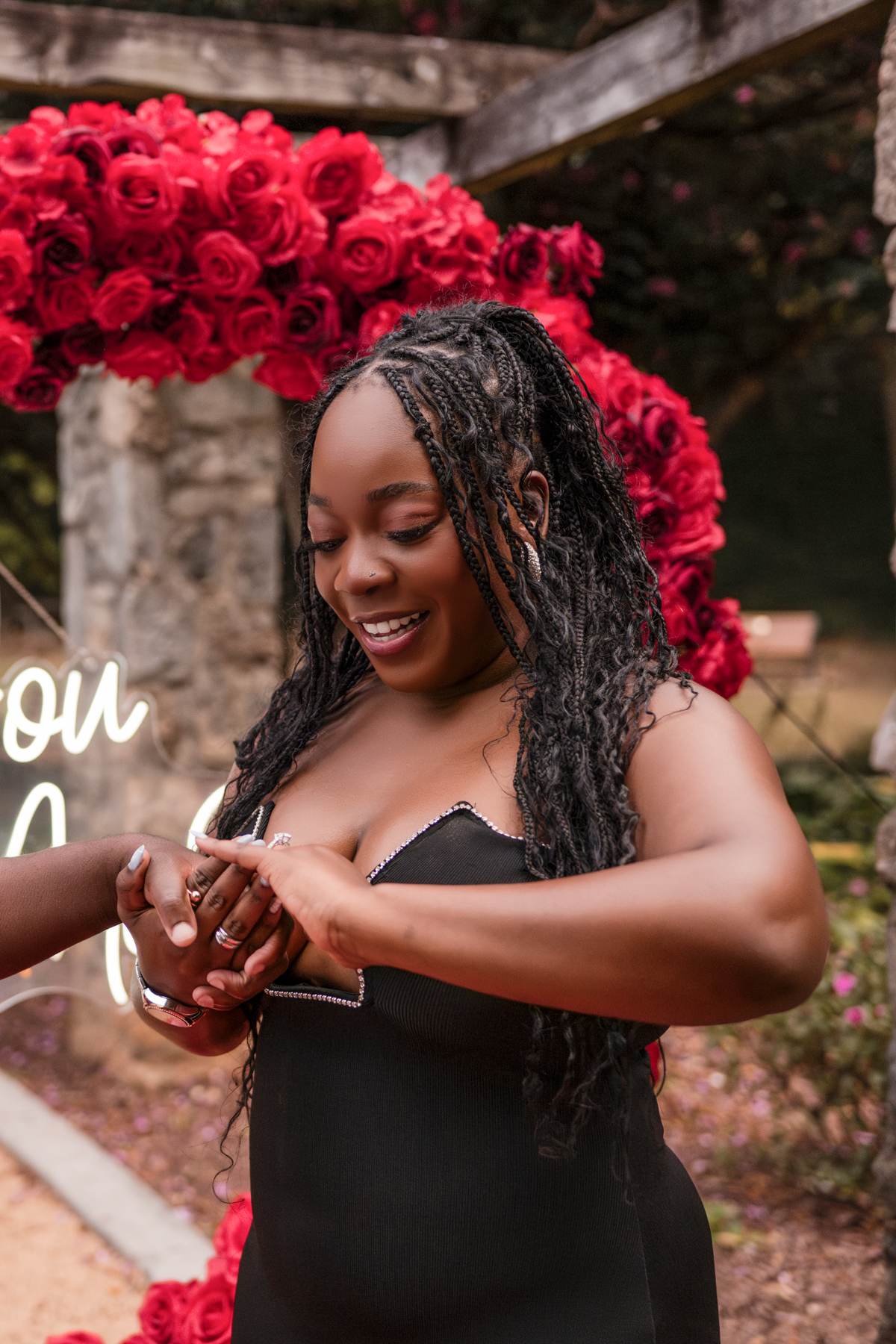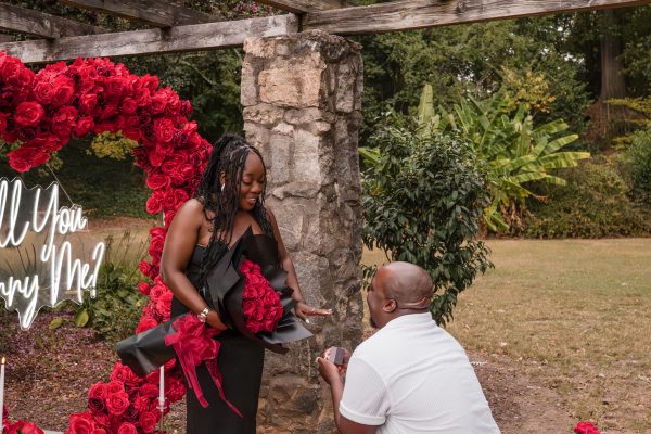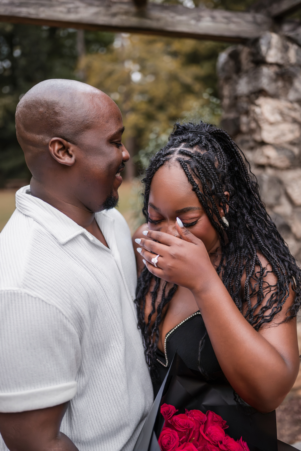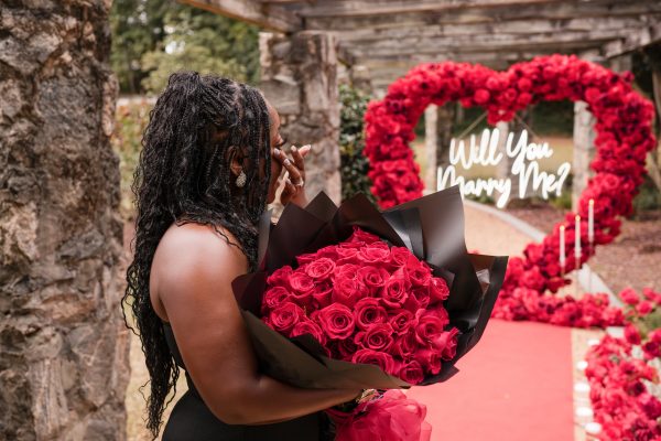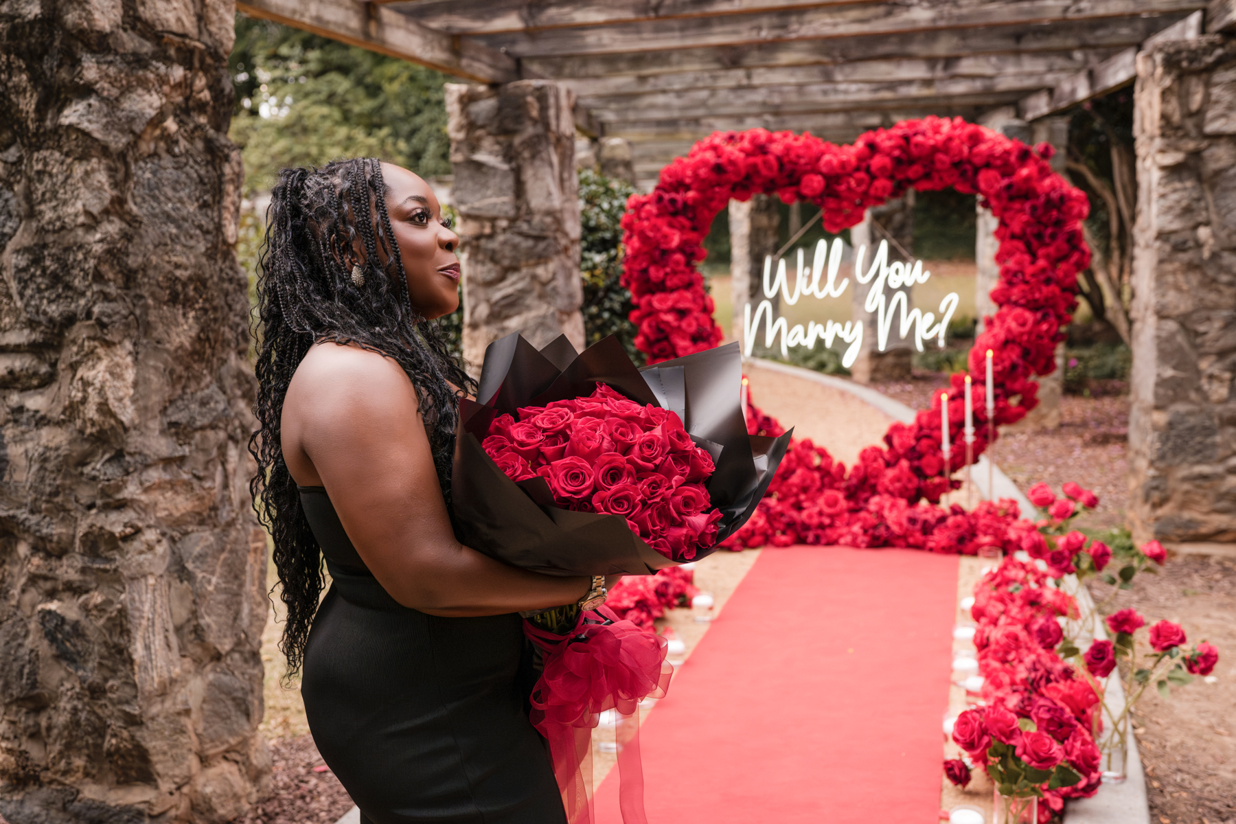 Once I got the text that they had arrived, I was on high alert. They strolled slowly together through the garden toward the red rose display, and the moment she began to realize what was happening, I stepped in and started photographing. The surprise landed fully, and her response was a perfect mix of shock, warmth, and even humor.