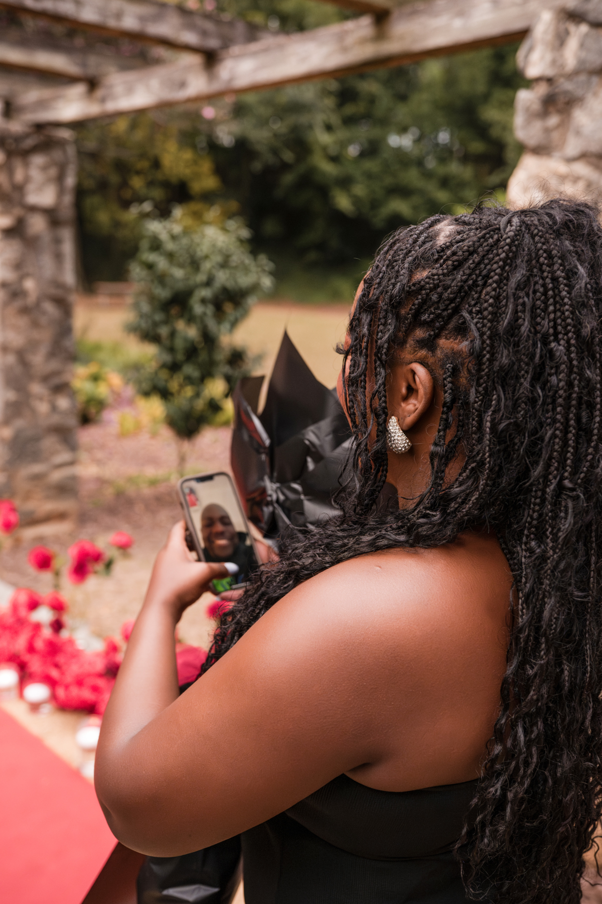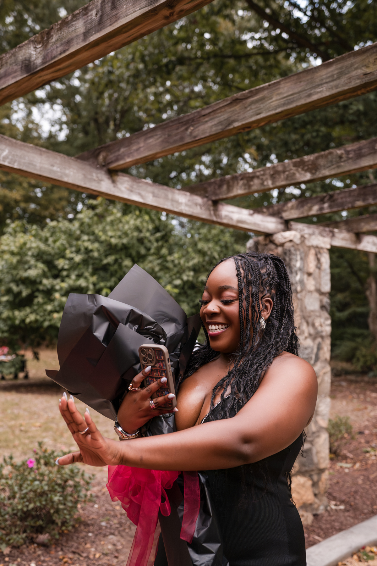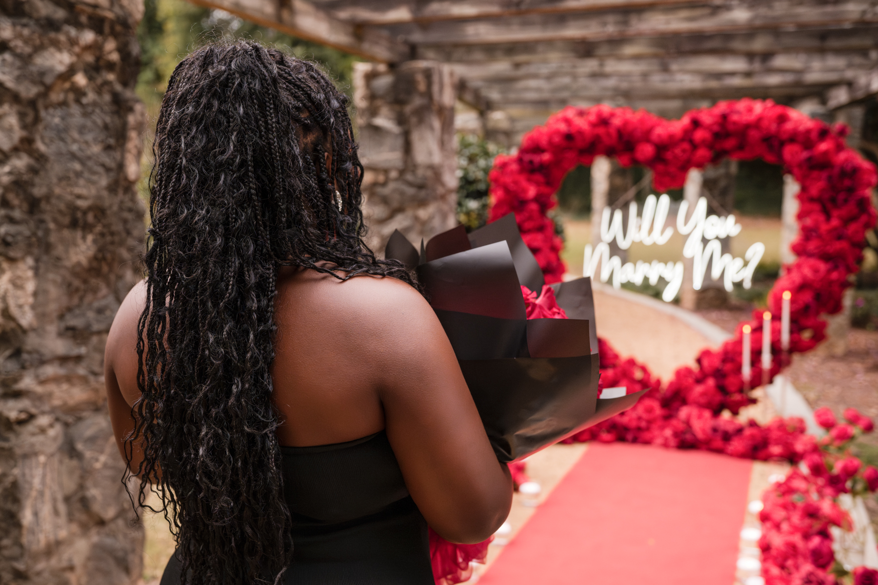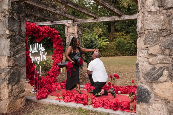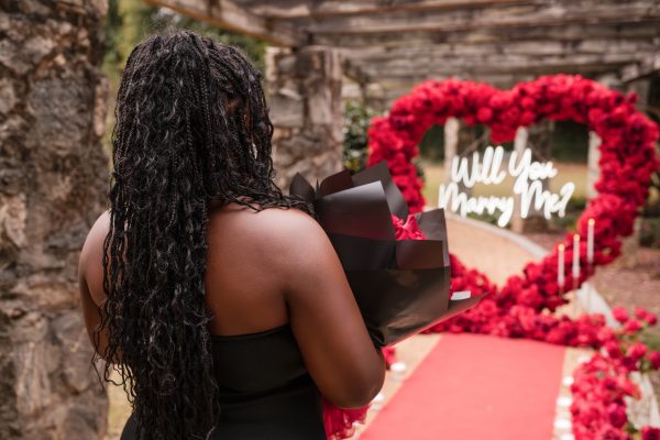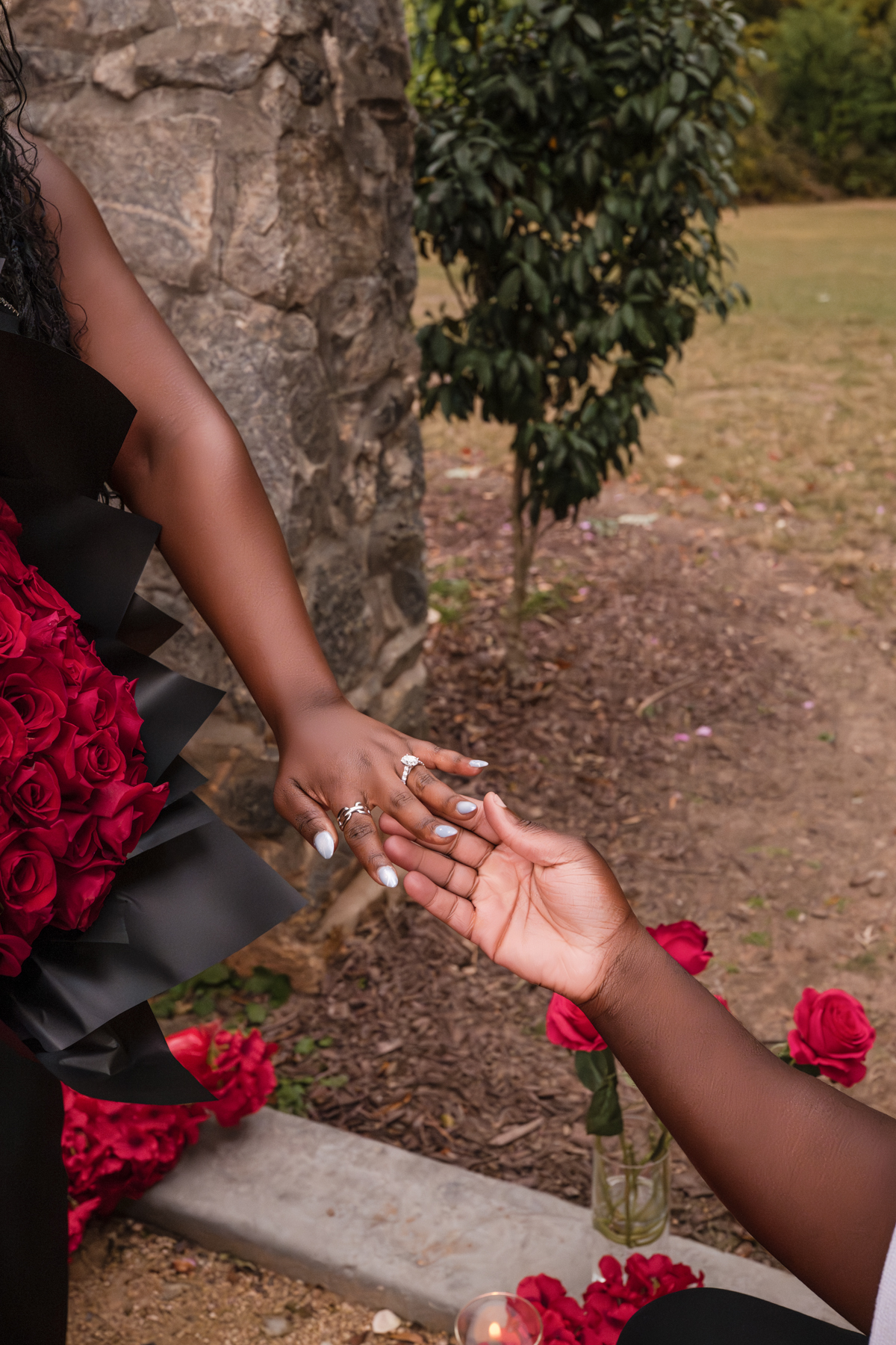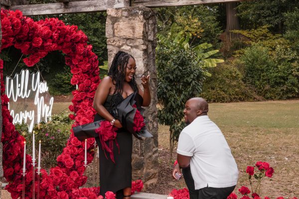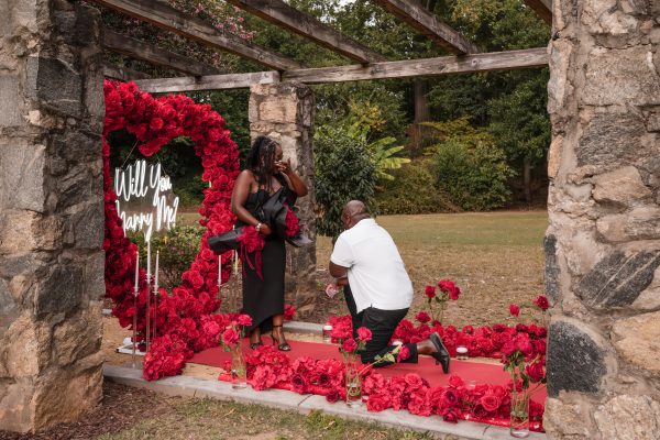 Once I got the text that they had arrived, I was on high alert. They strolled slowly together through the garden toward the red rose display, and the moment she began to realize what was happening, I stepped in and started photographing. The surprise landed fully, and her response was a perfect mix of shock, warmth, and even humor.