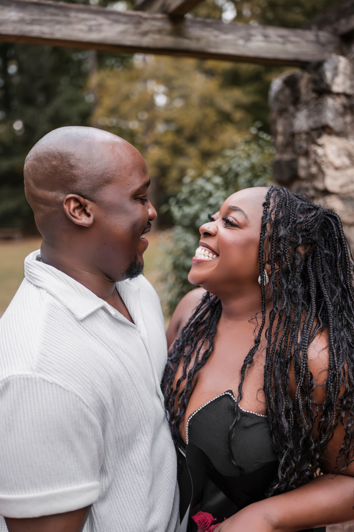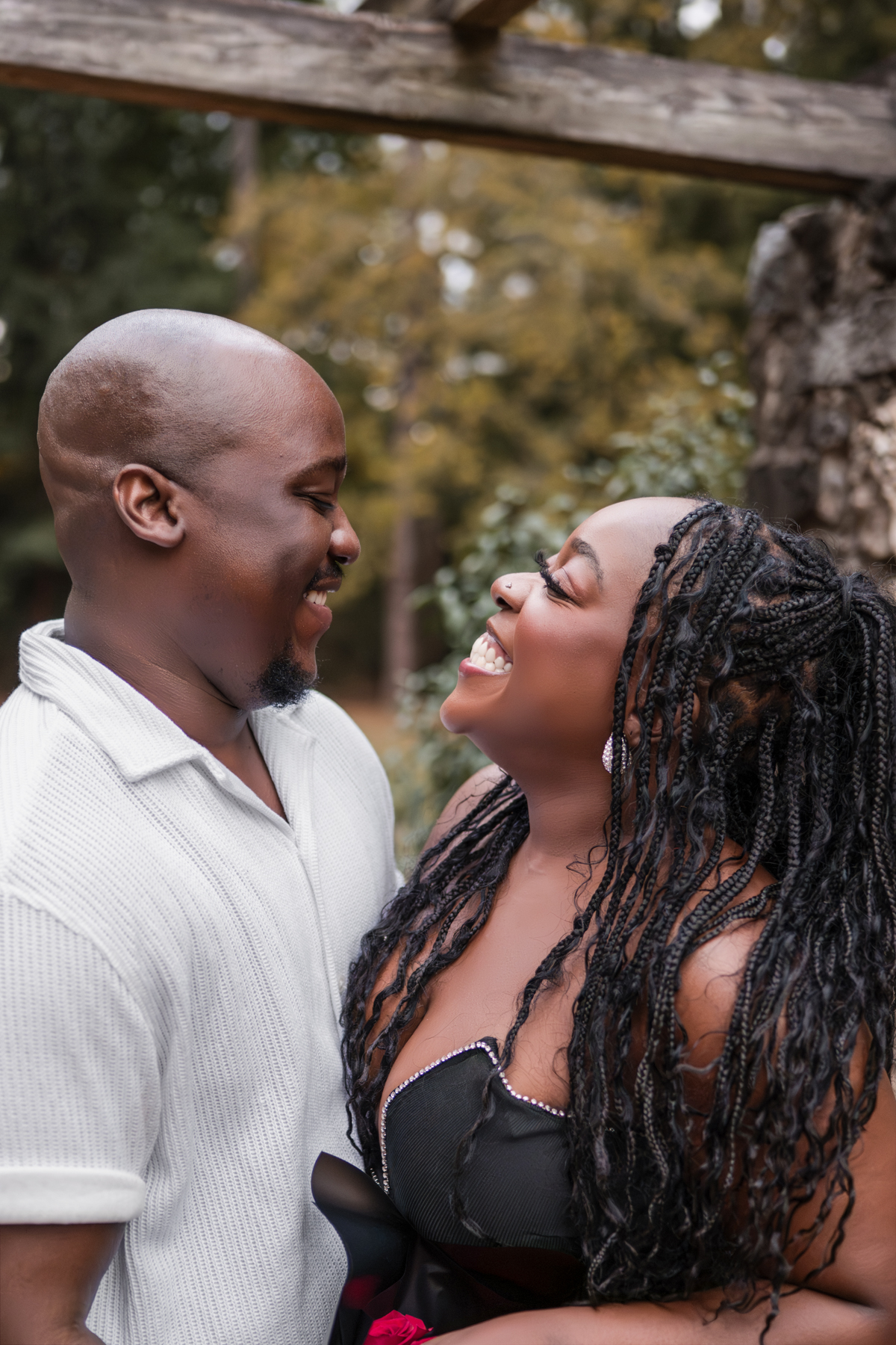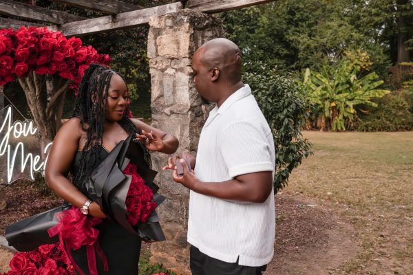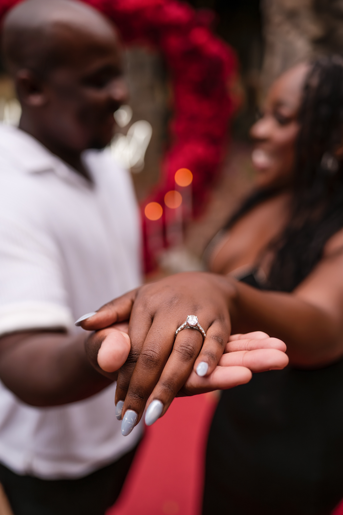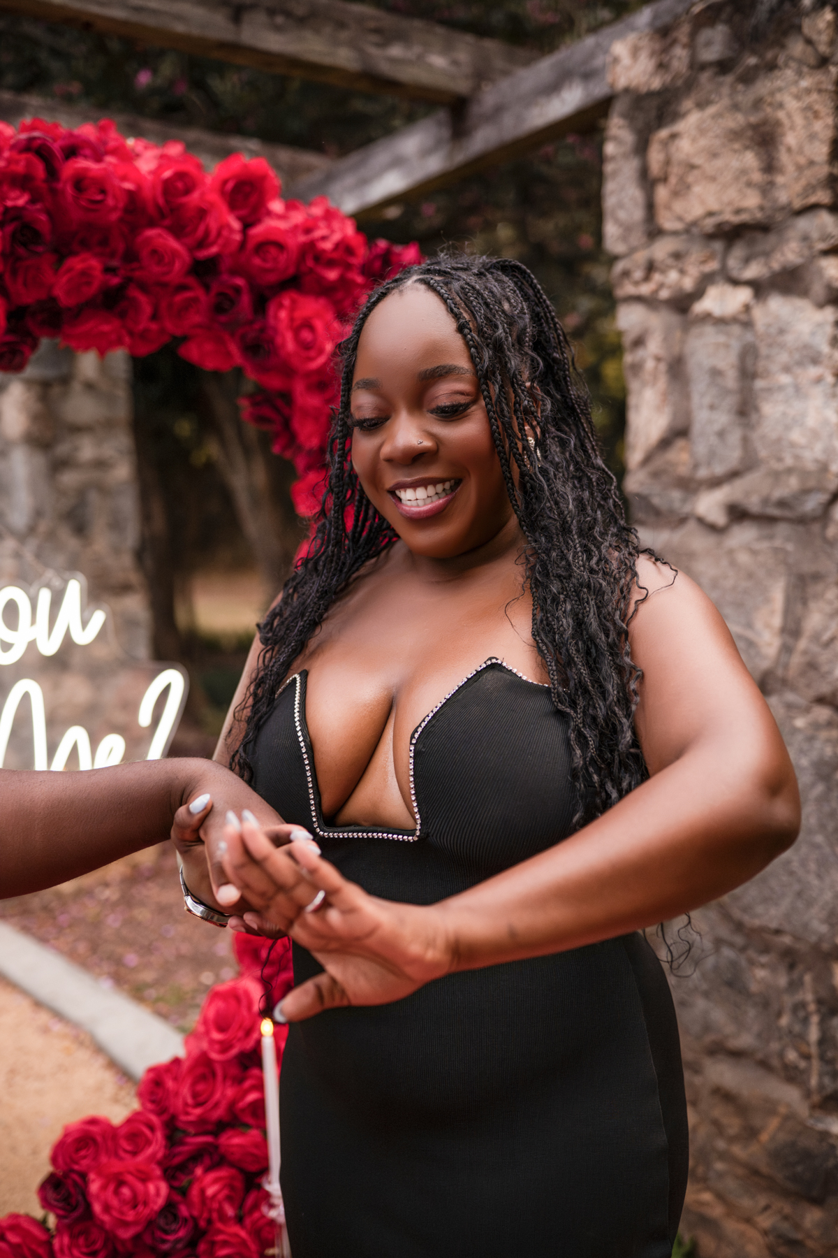 Once I got the text that they had arrived, I was on high alert. They strolled slowly together through the garden toward the red rose display, and the moment she began to realize what was happening, I stepped in and started photographing. The surprise landed fully, and her response was a perfect mix of shock, warmth, and even humor.